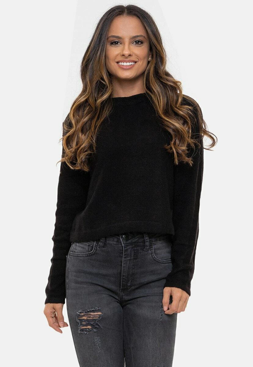 O modelo é confeccionado em tricô macio, fio diferenciado mousse, decote redondo e acabamento impecável.